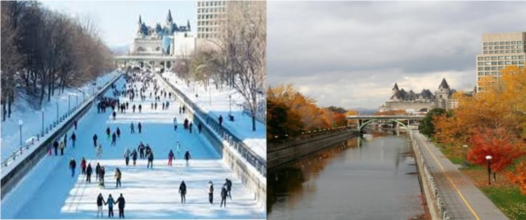 Kênh đào Rideau – một trong 800 di sản văn hóa thế giới. Vào mùa hè kênh là con đường thông thương tàu bè khi đông đến nơi đây trở thành sân trượt băng tự nhiên